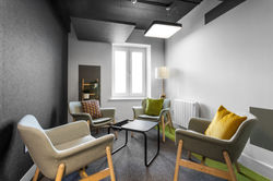 With 300 sqm, with 5 private session rooms, an open plan, office, meeting rooms canteen, and services have a home on a lively, warm design where the color travels.